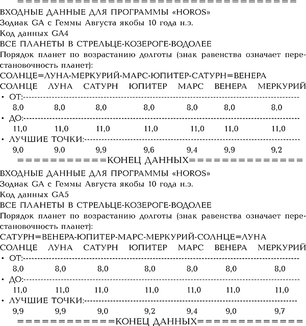 С помощью программы ГОРОС были проведены исчерпывающие расчеты с целью определить все даты в промежутке времени от 500 года до н. э. до 1900 года н. э., в которые семь планет древности собрались в созвездиях Стрелец-Козерог-Водолей. При этом требовалось, чтобы все планеты, кроме Солнца и Луны, располагались по одну сторону от последних — как это изображено на зодиаке GA. Проверка всех остальных перечисленных выше астрономических условий была отложена до следующего этапа — отсева предварительных решений. Однако никакого отсева не понадобилось, поскольку решение оказалось только