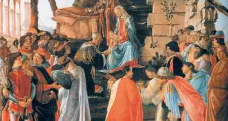 «Рождество Христово». Русская икона второй половины XVII века. Ростов Великий. Слева вверху — Волхвы едут к Христу. Слева внизу — Поклонение Волхвов. Справа внизу — Бегство в Египет. Взято из [120:1], с. 267.