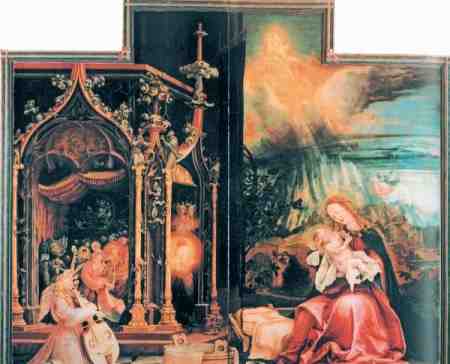 «Ангельский концерт». Изенгеймский Алтарь. Якобы 1515 год. Музей Унтерлинден. Кольмар. Поющие и играющие ангелы славят Рождение Иисуса. Справа вверху — Вифлеемская звезда. Взято из [143:0], с. 246.