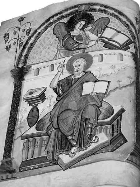 Считается, что современником и апостолом Христа был Левий Матфей, см. рис. 1.1. Интересно, что здесь Матфей изображен сидящим на троне. Он написал известное Евангелие, поставленное потом в самое начало Нового Завета. На рис. 1.2 показан первый лист одной из старинных копий Евангелия от Матфея, будто бы VIII века.