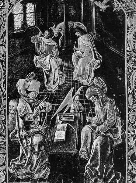 Остальные Евангелия, — а именно, от Марка, Луки, Иоанна, — СЛЕДУЮТ в каноне за Евангелием от Матфея. На рис. 1.6 приведено старинное изображение всех четырех евангелистов. На переднем плане — Матфей (справа) и Марк (слева). Судя по всему, текст Левия Матфея считался особо авторитетным. Поскольку скалигеровская история относит Флавия Филострата в III век н. э., ТО ОН МОГ ЗНАТЬ И ИСПОЛЬЗОВАТЬ более раннее Евангелие от Матфея при составлении «Жизни Аполлония Тианского». Ведь скалигеровская датировка жизни апостола Матфея, напомним, I век н. э. При сдвиге вверх на тысячу сто лет Матфей оказывается как раз в XII веке.