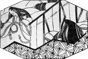 Сквозь щели ширмы виднелись стоявшие у самого занавеса подставки с намотанными нитями, и Тюнагон сразу же догадался.
