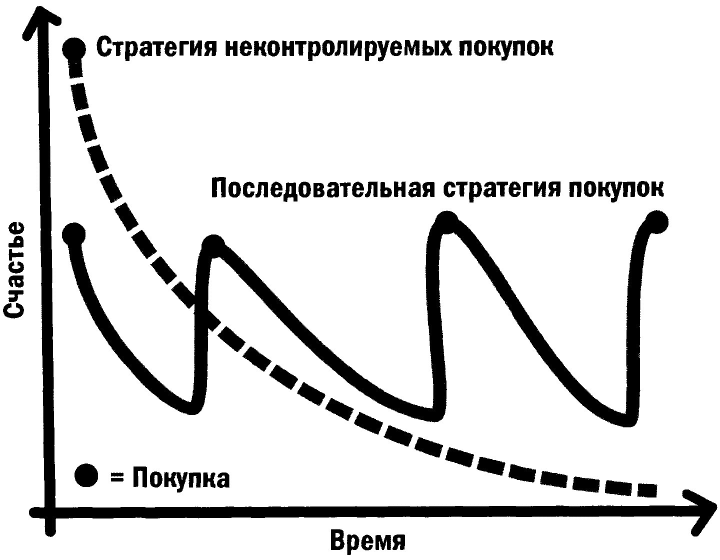 Приведенный ниже график иллюстрирует два возможных подхода Энн к своим тратам. Зона под пунктирной линией показывает уровень ее счастья при выборе стратегии неконтролируемых покупок. Потратив деньги, Энн будет чувствовать себя очень счастливой, однако ее счастье будет таять по мере привыкания к новым вещам. Площадь под сплошной линией отражает уровень ее счастья при использовании последовательной стратегии покупок. В этом случае Энн не будет испытывать после покупок столь же сильного счастья, как в первом случае, однако оно будет более длительным благодаря постоянным покупкам. Какой же вариант лучше? По всей видимости, при использовании последовательного подхода Энн сможет создать для себя более высокий уровень общего счастья.