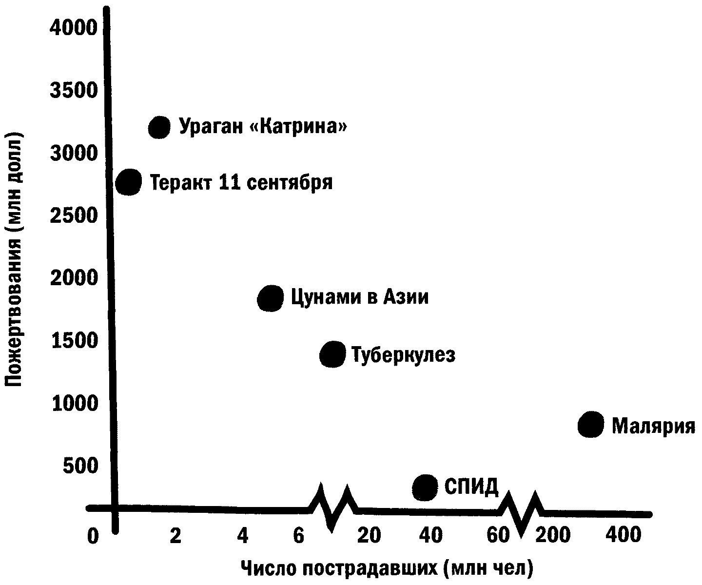 Для того чтобы задуматься о проблеме неправильного распределения ресурсов в более глобальном смысле, обратите внимание на график, приведенный ниже [99] . На нем отмечены суммы пожертвований, связанных с целым рядом катастроф (ураганом «Катрина», террористическими актами 11 сентября, цунами в Азии, туберкулезом, СПИДом и малярией), а также число людей, напрямую затронутых этими трагедиями. График однозначно демонстрирует, что по мере роста количества жертв сумма благотворительных взносов снижается. Также можно заметить, что трагедии, затронувшие США (ураган «Катрина» и террористические акты 11 сентября), вызывали значительно больший приток благотворительных взносов по сравнению с прочими (например