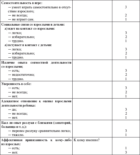 В приложении 1 к инструктивному письму обозначены основные показатели определения готовности ребенка к поступлению в дошкольное учреждение (см. таблицу 4). Наблюдая за ребенком в ходе встречи и разговора с родителями, психолог формирует первичное представление о готовности ребенка к детскому саду.