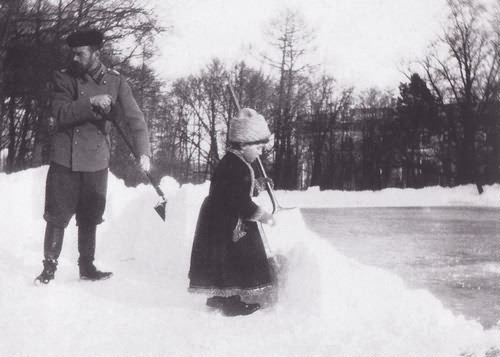 Государь Император Николай II и Наследник Престола Алексей Николаевич за расчисткой катка в Царском Селе.