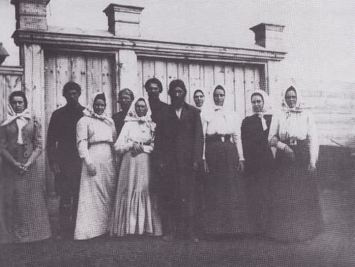 Сидят (слева направо): З. Тимофеева, М. Е. Головина, М. С. Гиль, Г. Е. Распутин, О. Клейст, отец Г. Е. Распутина Ефим Яковлевич.