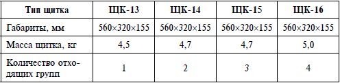 Щитки выпускаются с резьбовыми предохранителями или автоматическими выключателями типа АБ-25, устанавливаемыми в фазном и нулевом проводах. Квартирные щитки типа щк– 13—ЩК-16 устанавливаются в нишах и выпускаются с вводными двухполюсными пакетными выключателями ПВ-2-25 и резьбовыми предохранителями типа Ц27 (ЩК-14, ЩК-16) или автоматическими выключателями типа АБ-25 (ЩК-13, ЩК-15). Щитки устанавливаются на стене и монтируются после устройства ввода и выполнения внутренней электропроводки.