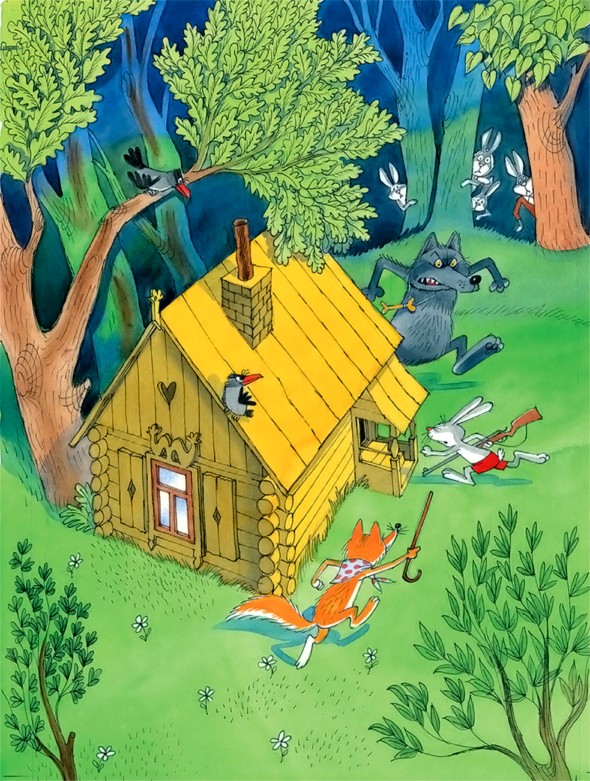 Бросился Зайка-Зазнайка в горницу, а Волк и Лиса в дверях застряли — спорят, кому Зайца есть.