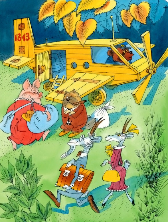 Сидят пассажиры на своих местах. Хавронья с аппетитом ест. Приоткрыл пилот Медведь дверь своей кабины. Зевнул. Пересчитал пассажиров.