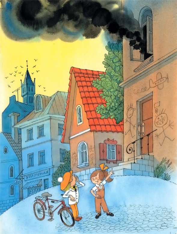 …Фантик свернул за угол и оказался на улице Мушкетёров. То, что он увидел, ошеломило его. Это была уже не улица, а самая настоящая Выставка детских рисунков. Только эту выставку нельзя было послать ни в одну страну, потому что рисунки можно было только смыть водой со стёкол витрин, со стен домов и заборов.