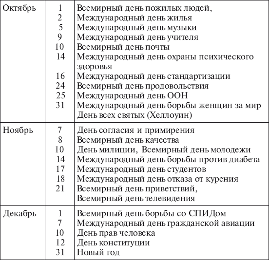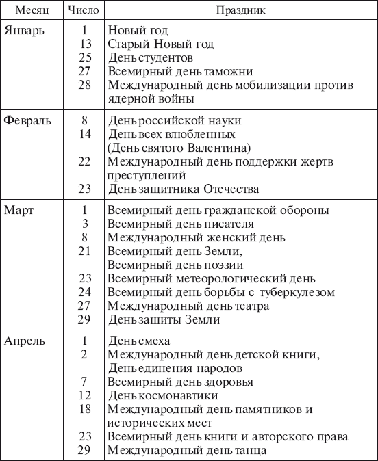 В России на государственном уровне признаны 8 праздников: Новый год, Рождество Христово, День защитника Отечества, Международный женский день, Праздник весны и труда, День Победы, День России, День примирения и согласия и День Конституции. Все они являются нерабочими днями. Не так давно был признан государственным всеми любимый праздник мужчин, отмечающийся 23 февраля. Однако, помимо таких общепризнанных и традиционных праздников, как Новый год или 8 марта, в последние годы набирают обороты «заморские пришельцы» День святого Валентина и Хэллоуин, привлекающие на свою сторону все большее число поклонников.
