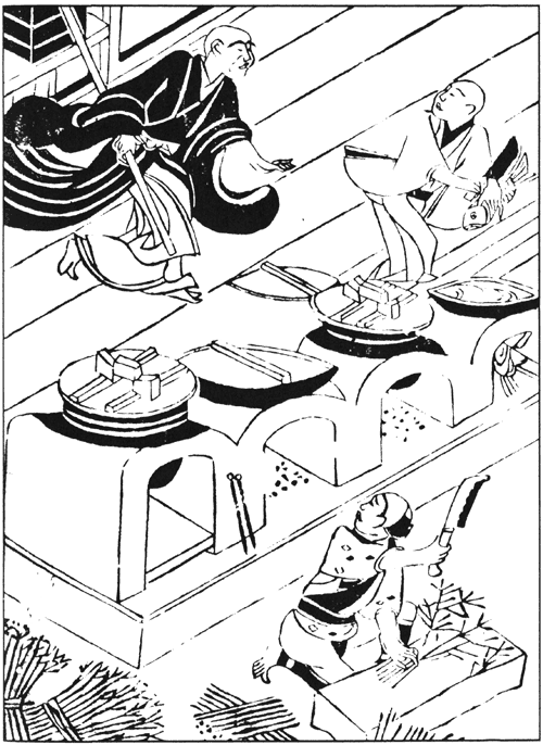 Иккю пустился бегом в рыбную лавку, купил карпа пожирнее, а вернувшись, приготовил суп мисо — и вот, когда он крепко сжал карпа и занёс над ним овощной нож, чтобы снести ему голову, его увидел монах-наставник.