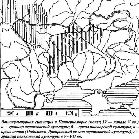Теперь нам предстоит описать тот котел, в котором «сварились» славяне, вошедшие в историю уже под своим собственным именем. Речь идет о той части будущей славянской территории, которая первой попала в поле зрения позднеримских и византийских авторов. На западе это Нижний Дунай, на востоке — Поднепровье, на севере — от Прикарпатья до верхних границ днепровского бассейна, на юге — побережье Черного моря. Интерееующий нас период — со II по IV век н. э. Что же тут происходило? Это сплошное «кипение этнического котла».