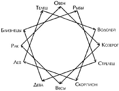 Третье, на что мы будем ориентироваться в своей диагностике, отображено на рисунке 2. Дело в том, что в одной из астрологических систем говорится: человек за одно воплощение, развиваясь, меняет свой характер, постепенно приобретая черты другого зодиакального знака. Так, например, Скорпион, идя по пути развития своей души, неизбежно приобретает качества Льва. (Лев — Тельца, Телец — Водолея и т. д.).