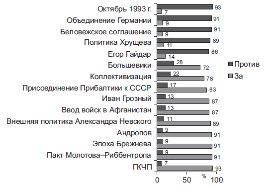 Рассмотрим для иллюстрации сложившейся ситуации результаты резонансного телепроекта «Имя России» (рис. 1). Долгое время в рейтинге национальных героев лидировал, как известно, И. Сталин. И даже в итоговом деформированном виде в список 12 первых мест вошли и Сталин, и Ленин, и Иван Грозный – фигуры, традиционно дезавуируемые в либеральной историографии. Проект стал своеобразным индикатором нового национального раскола.