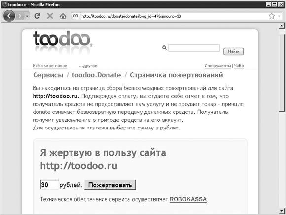 Сервис toodoo.Donate от социального сервиса toodoo также позволяет установить в блог кнопку пожертвований и собирать платежи. Преимуществом данного сервиса является работа через систему ROBOXchange, которая позволяет переводить деньги практически всеми доступными способами (рис. 2.41).