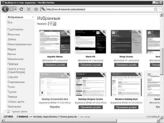 Display of tags in sidebar (Отображение тегов на боковой панели) – этот параметр настраивает отображение тегов на боковой панели блога. Поскольку в «Живом Журнале» нет рубрик, вы можете организовать теги на манер рубрик, поставив данный параметр в положение list (Список). Используйте небольшое количество тегов, не больше 15–20, тогда ваш блог будет выглядеть более профессионально.