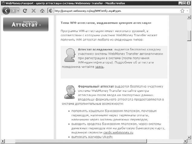 Каждый пользователь системы имеет WM-аттестат – удостоверение личности в системе WebMoney. Аттестаты бывают нескольких уровней (рис. 2.3). Проще всего сразу получить «Формальный аттестат», поскольку для этого достаточно ввести свои паспортные данные.