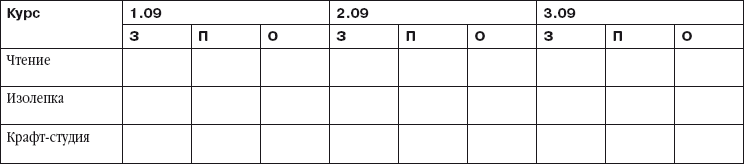 Также полезно завести таблицу под названием «Табель учета рабочего времени». Ничего общего эта таблица с настоящим табелем иметь не будет. Шапку также следует разбить на рабочие дни в месяце, а строки будут показывать рабочие часы. В полученных ячейках нужно указывать количество детей, присутствующих на занятии (табл. 4.2).
