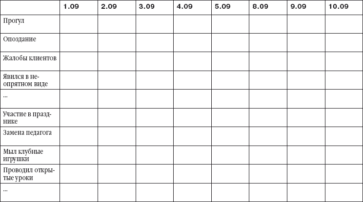Предлагаю воспользоваться этим принципом для составления последней, третьей, таблицы. В ней вы будете учитывать качественные характеристики каждого педагога. Таблица строится следующим образом. В верхней графе указываются даты, а в строках вы будете оценивать характеристики: аккуратность прически, опоздания, опрятность одежды и т. д. (табл. 4.3).