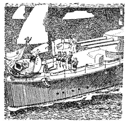 Від удару я знепритомнів, а коли отямився, дивлюся — «Біда» лежить боком, на палубі величезного корабля. Фукс заплутався в снастях. Лом — той зовсім вивалився від поштовху й сидить тут же поряд у дещо незручній позі. А назустріч нам під захистом далекобійних гармат виступає величною ходою невеличка група панів у чинах, зважаючи на мундири, не нижче адміральських.