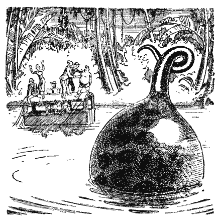 І ось бачимо — спливає щось над водою: блискучий балон велетенських розмірів, дивовижної форми, дуже оригінального забарвлення. І все, знаєте, пухне, пухне…