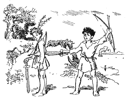 — То ти — цей знаменитий розбійник? Я радий посперечатися з тобою мечем за володіння цим веселим лісом. Захищайся!