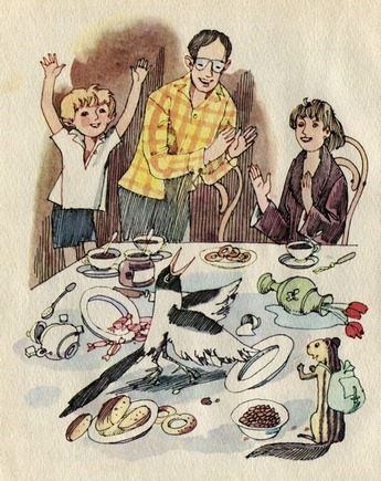 Когда через некоторое время мама с обычной приветливостью позвала всех ужинать, Бориска с папой сели за стол, а Бук и Сорока не шевельнулись.