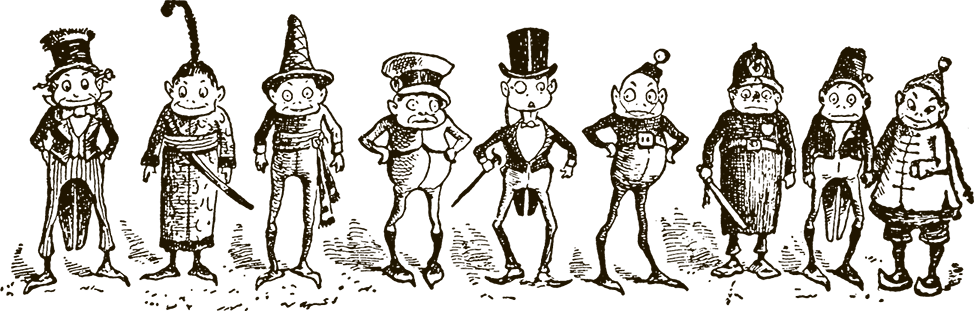 Собратья его хоть и любили, но не воспринимали всерьёз: был он ленив и болтлив да к тому же хвастун изрядный. Щеголял в длинном фраке, высокой чёрной шляпе, сапогах с узкими носками, поигрывая тросточкой и посверкивая моноклем, и очень собой гордился, в то время как окружающие над ним лишь посмеивались.