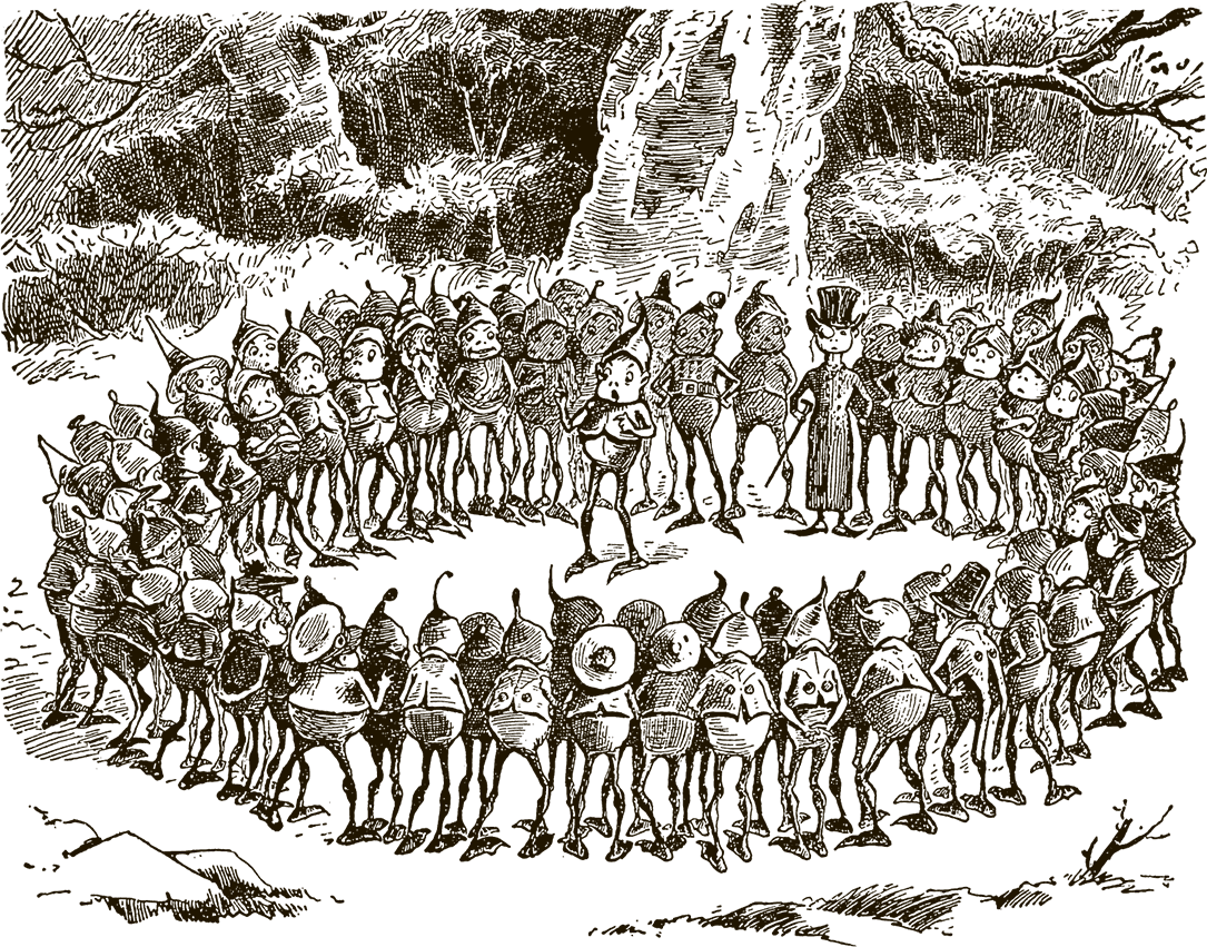 В дремучем лесу далёкого Севера, под перистыми листьями папоротника, весело и беззаботно жили малютки эльфы, лесные человечки. Их так много, что сосчитать невозможно. Все они очень странные на вид: с тоненькими ножками, большими, не по росту, головами, огромными выпученными глазами. Есть среди лесных человечков старики с длинными бородами, есть и молодые, даже малютки. И одеты все они очень странно: кто в длиннополом фраке, кто в куртке, кто в матросской рубашке, кто в огромной меховой шубе. Кто-то щеголяет в китайском цветном халатике, кто-то – в японском кимоно. У одних голову украшает высокая шляпа, у других – колпак, треуголка, жокейская шапочка и даже турецкая феска.