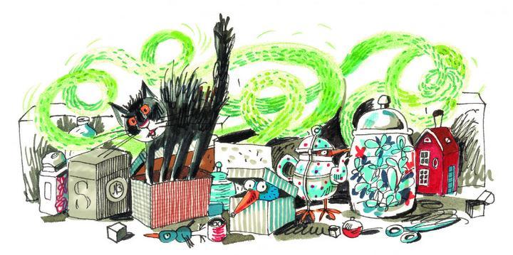 Никакой бумаги в коробке не оказалось, зато из неё вдруг выскочила крупная чёрная кошка с золотыми глазами и стала яростно шипеть и плеваться на человечка. В ответ он дал кошке шлепка, быстро сунул её обратно и плотно закрыл крышку.