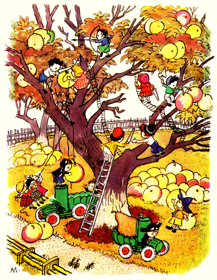 Механизирането значително облекчи труда и работата тръгна по-бързо. Двете коли сновяха насам-натам и разнасяха по мазетата плодовете. Ябълките и крушите караха една по една, а сливите — по пет наведнъж. Благодарение на механизацията много момиченца се освободиха от работа, но вместо да седят със скръстени ръце, те разпънаха на улицата две палатки. В едната палатка донесоха сироп и газирана вода, а в другата натрупаха баници, различни курабийки, кравайчета и бонбони. Сега всеки от работещите можеше да закуси и да си пийне през време на почивката.
