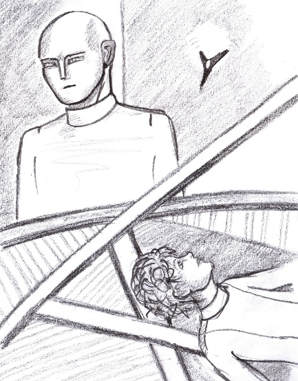 Красная униформа, гладкий безволосый череп, мыслеклипса для приема команд на левом ухе: всего-навсего андроид из команды технической обслуги. Топает размеренным шагом по своим техническим делам, глядя прямо перед собой. Андроиды всегда такие, знать не знают ничего, кроме порученного им задания.