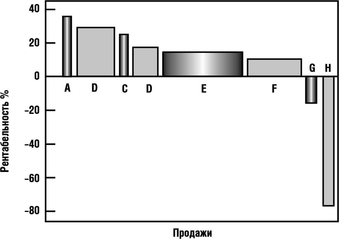 Здесь показано соотношение 59/15 и соотношение 88/25: доля наиболее прибыльной категории клиентов составляет 15 %, но именно эти клиенты приносят 59 % прибыли, а наиболее выгодные 25 % приносят компании 88 % прибыли. Это происходит не только потому, что самые выгодные для компании клиенты закупают самую прибыльную продукцию, но и потому, что они платят больше в сравнении со стоимостью их обслуживания.