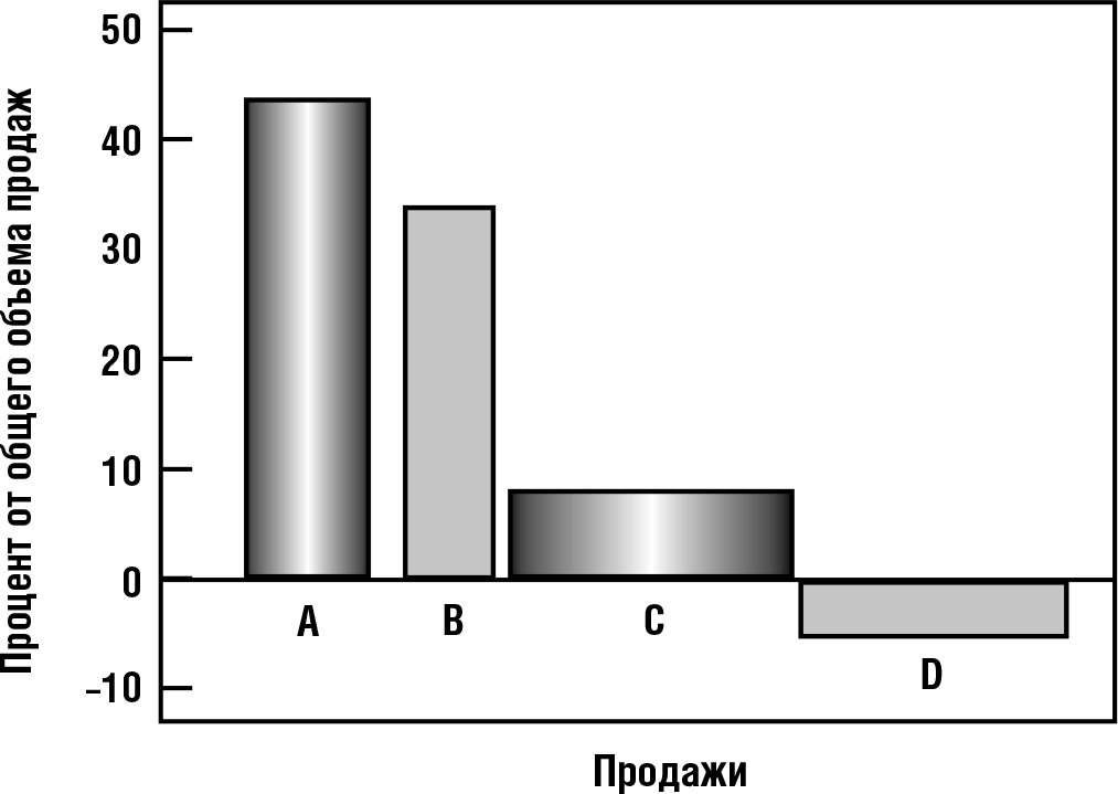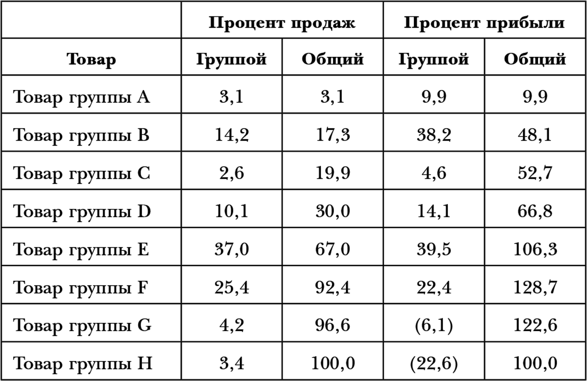 Возможно, сейчас вы уже начали думать над тем, что нужно сделать, чтобы увеличить продажи товаров групп А, В, С. Например, можно перенаправить все усилия, нацеленные на сбыт остальных 80 % товаров, сказать своим продавцам сконцентрироваться на удвоении продаж товаров групп А, В и С и не беспокоиться об остальных группах. Если это им удастся, объем продаж вырастет всего на 20 %, зато прибыли увеличатся более чем на 50 %.