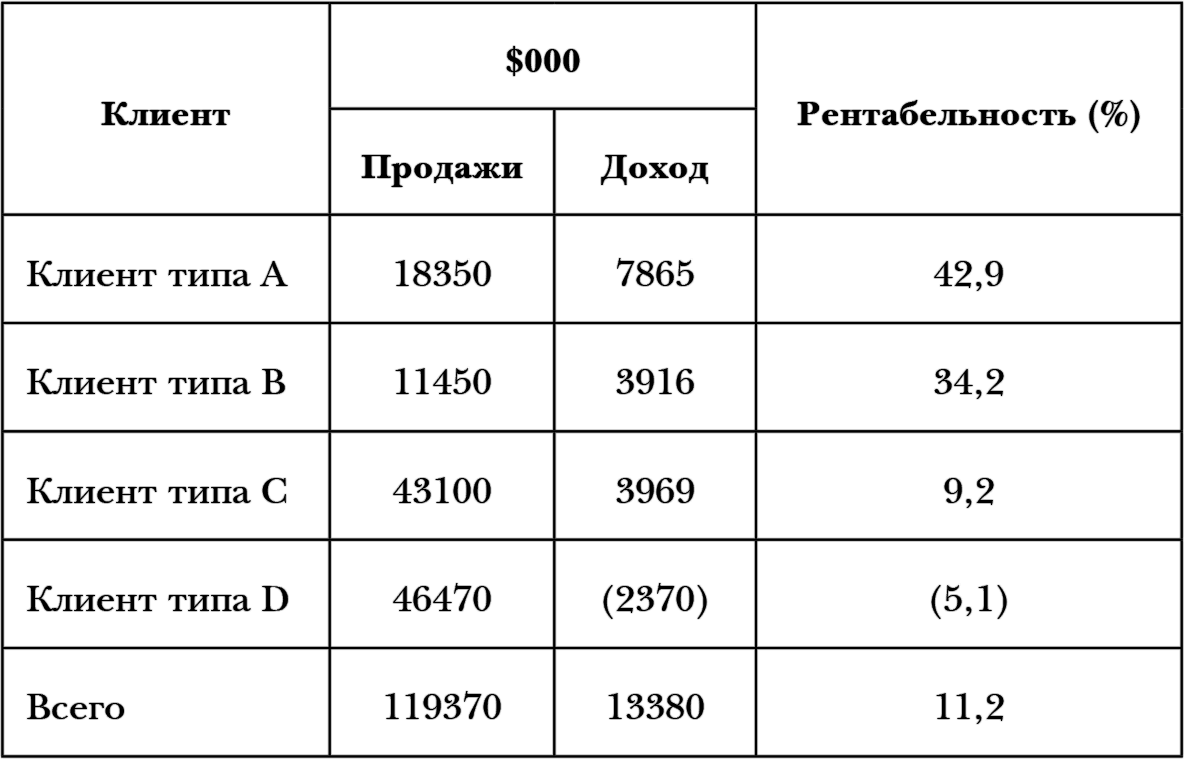 Поясним немного, что подразумевается под группами клиентов. Клиенты типа А – не очень крупные клиенты, работающие с вами напрямую по очень высоким ценам и приносящие львиную долю вашей прибыли. Их довольно дорого обслуживать, однако получаемая от них прибыль с лихвой компенсирует затраты на сервис. Клиенты типа В – это дистрибьюторы, которые заказывают много и недороги в обслуживании, но которые, однако, по тем или иным причинам не согласны платить высокую цену за вашу продукцию, в основном потому, что закупаемые ими электронные компоненты составляют лишь малую часть от общей себестоимости их продукции. Клиенты типа С – это экспортеры, которые платят очень высокую цену. Проблема взаимодействия с ними заключается в том, что они очень дороги в обслуживании. Клиенты типа D – это крупные производители, которые усиленно пытаются сбить цену, а также требуют технической поддержки и «других привилегий».