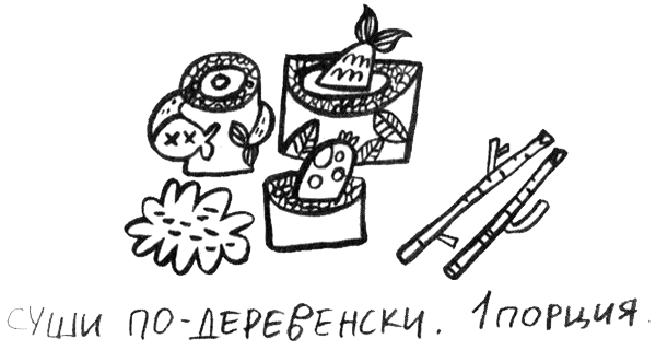 И Бабака не отстаёт. Баба Моня для неё авторитет и пример для подражания. Всего неделю живём в деревне, а Бабака уже научилась и поросят кормить, и Бурёнку доить, и бельё полоскать в ручье. Бабушка щи с квашеной капустой научила её варить и рыжики солить в кадушке. А Бабака в свою очередь устроила вечер японской кухни. Показала бабе, как роллы надо крутить. Вместо васаби, правда, у нас была горчица — бабы-Монина, ядрёная, а вместо угря — копчёный лещ. С бабой Моней после этого случился гастрономический шок. Помню, она сказала: