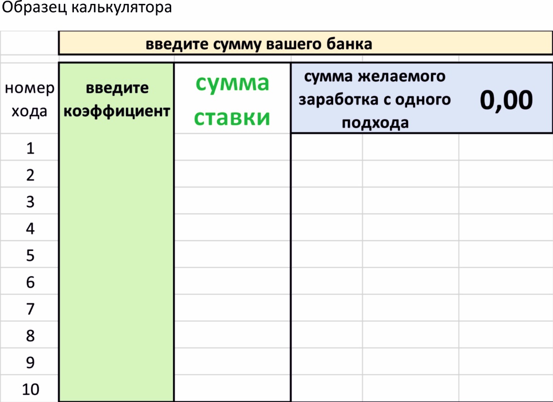 Для работы на БК вам понадобится калькулятор добора (находится на сайте EVGENYIKOSTYUK.RU). В ячейку «введите сумму вашего банка» необходимо ввести сумму, от которой следует рассчитать сумму фиксированной прибыли. Калькулятор построен таким образом, чтобы автоматически рассчитывать и «сумму желаемого заработка с одного подхода» исходя из суммы вашего банка, но, если вы хотите установить свою фиксированную сумму заработка, просто введите ее в ячейку «сумма желаемого заработка с одного подхода». И так, в ячейку «сумма желаемого заработка с одного подхода» введите 500 рублей, а в ячейку «введите коэффициент», соответственно – коэффициент. В ячейках столбца «сумма ставки» появится сумма для ставки. Калькулятор рассчитывает как единичный, так и серийный ход. В общем учитывает проигрыши, коэффициенты и выдает сумму ставки.