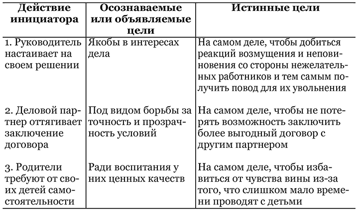 Для большинства людей характерно считать цели своего воздействия на людей (или объявлять их) благородными, то есть продиктованными интересами дела, общества, развития, творчества и т. д.