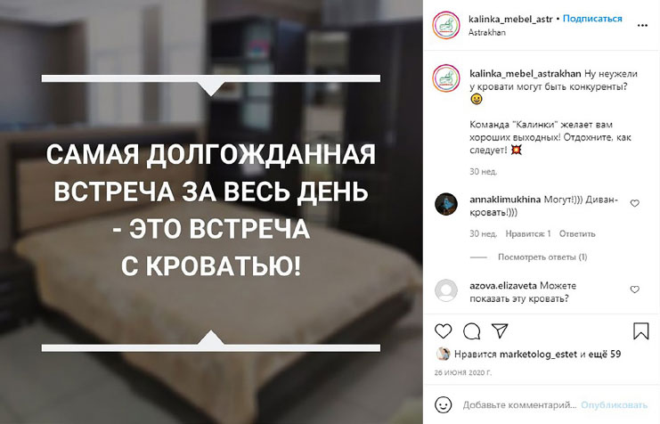 Вы можете взять фото своей мебели в интерьере и добавить на него 7–12 предметов, животных или смайлов и попросить подписчиков посчитать, сколько их на фотографии, или найти отличия. А еще найдите фото с кухней, на которой что-то сделано не так, как должно быть, и попросите подписчиков найти неправильную работу мастера. Или переделайте один из популярных мемов под свою тему. Если у вас более дорогой сегмент, показывайте самые последние решения. Поле для творчества у вас огромное, придумывайте свои идеи и воплощайте их на 100 % качества в изображении и тексте.
