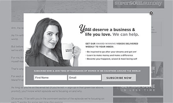 Рис. 12. Профессионально оформленное всплывающее окно на сайте marieforleo.com