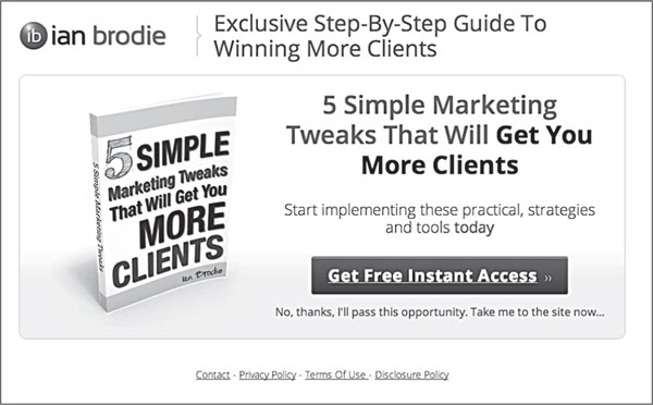 На некоторых сайтах (включая мой) используется менее навязчивая альтернатива всплывающим окнам – приветственная страница. В таких случаях при первом посещении главной страницы пользователь перенаправляется на специальную целевую страницу, где предлагается магнит для потенциальных клиентов. Пользователь не обязан его получать: с этой страницы можно вернуться на главную. При этом с точки зрения показателя подписки приветственная страница почти так же эффективна, как всплывающее окно.