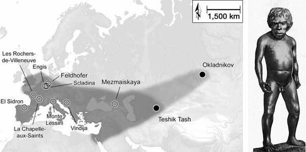 Ареал неандертальцев. Темно-серым показаны прежние представления о распространении неандертальцев, основанные на морфологии найденных костей; светло-серым — расширение ареала на восток, основанное на генетическом анализе костей из пещеры Окладникова. Кружками отмечены точки, где в ископаемых костях установлено присутствие мтДНК неандертальского типа (Krause et ai. Neanderthals in central Asia and Siberia // Nature, 2007). Справа: Неандертальский мальчик из грота Тешик-Таш. Реконструкция М. М. Герасимова.