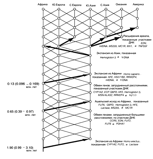 Более того, данные Темплтона показывают, что обмен генами между евразийскими и африканскими популяциями наших предков практически никогда не прекращался, хоть и был сильно затруднен большими расстояниями. Получается, что древнее человечество вовсе не было совокупностью изолированных популяций оно было относительно