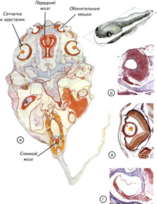 а — горизонтальный срез через тело головастика (показано в верхнем правом углу); б — срез через обонятельный мешок; в — срез через сетчатку и хрусталик глаза; г — поперечный срез через участок внутреннего уха.