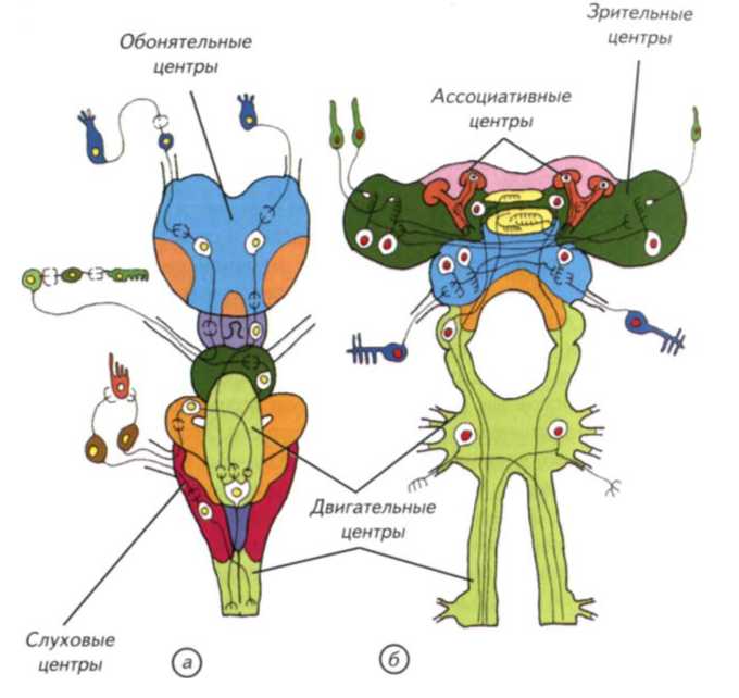 Сходные анализаторные системы окрашены в идентичные цвета. а — позвоночное; б — насекомое. Несмотря на глубокие морфологические различия в эволюционных стратегиях становления головных отделов нервной системы, обе конструкции имеют множество общих черт. Обработка информации от анализаторов разделена в специализированных структурах головных ганглиев и головного мозга, а ассоциативные системы обособлены и часто стратифицированы.