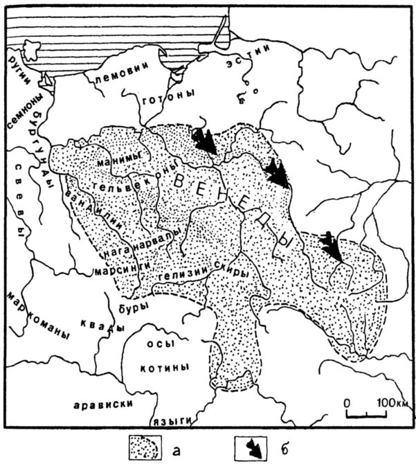 Расселение племен по историческим данным в первые века нашей эры. а — ареал пшеворской культуры; б — направления миграции готов к Черному морю