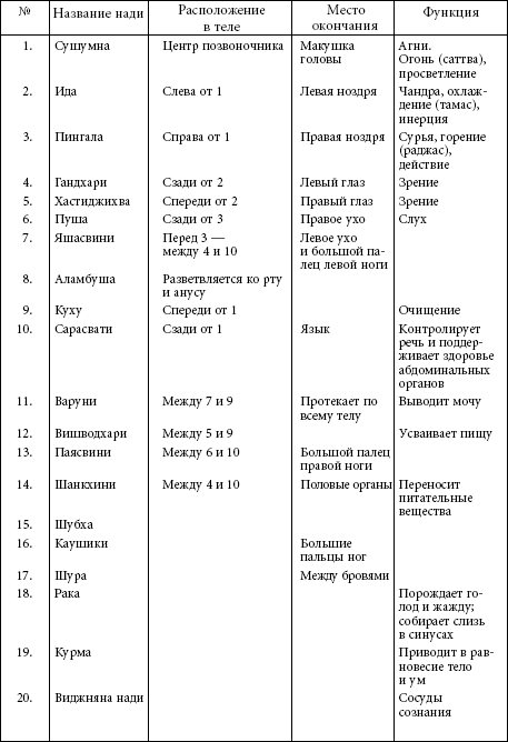17. Некоторые нади, дхамани и сиры могут совпадать с артериями, венами и капиллярами дыхательной и кровеносной систем. Они также могут совпадать с нервами, каналами и протоками нервной, лимфатической, эндокринной, пищеварительной и мочеполовой систем физического и физиологического тела. Другие несут жизненную энергию (прана) к ментальному телу, интеллектуальную энергию (виджняна) – к интеллектуальному телу и духовную энергию – к каузальному или духовному телу (душе). Конечная точка каждого нади находится в фолликуле, клетке или волосе. Они служат для входа и выхода различных энергий. Всего в грубом, тонком и причинном телах их количество составляет 5,9 миллиардов. Поэтому неудивительно, когда говорят, что тело наполнено нади.