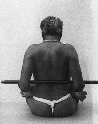п) Если во время вдоха плечи поднимаются, верхняя часть легких не будет полностью расширяться, и в задней части шеи будет возникать напряжение. Следите за этим и, как только плечи начинают подниматься, немедленно опускайте их вниз (фото 52). Для того чтобы держать их опущенными, а грудную клетку поднятой, используйте шест или отягощения, как показано на фото 71–74.